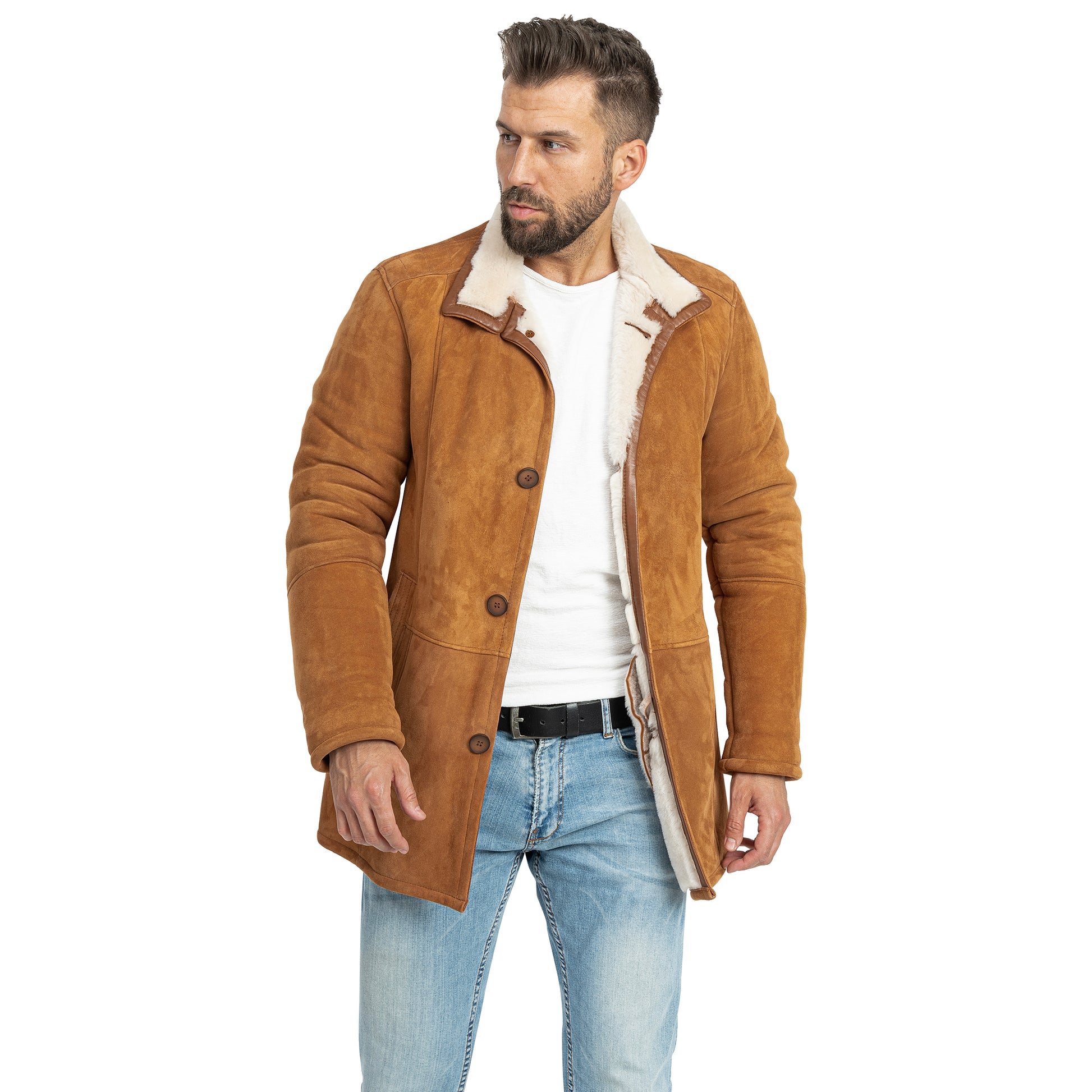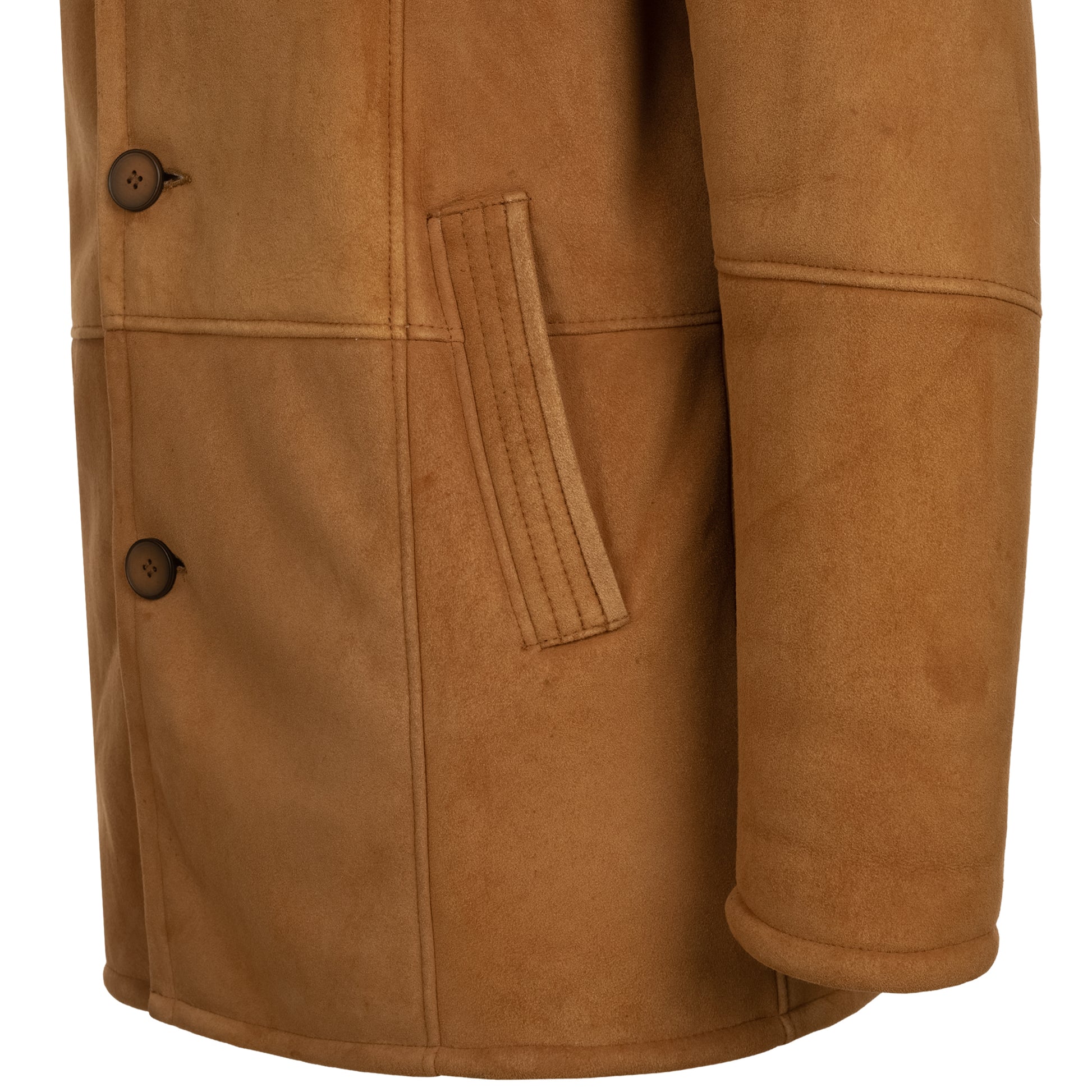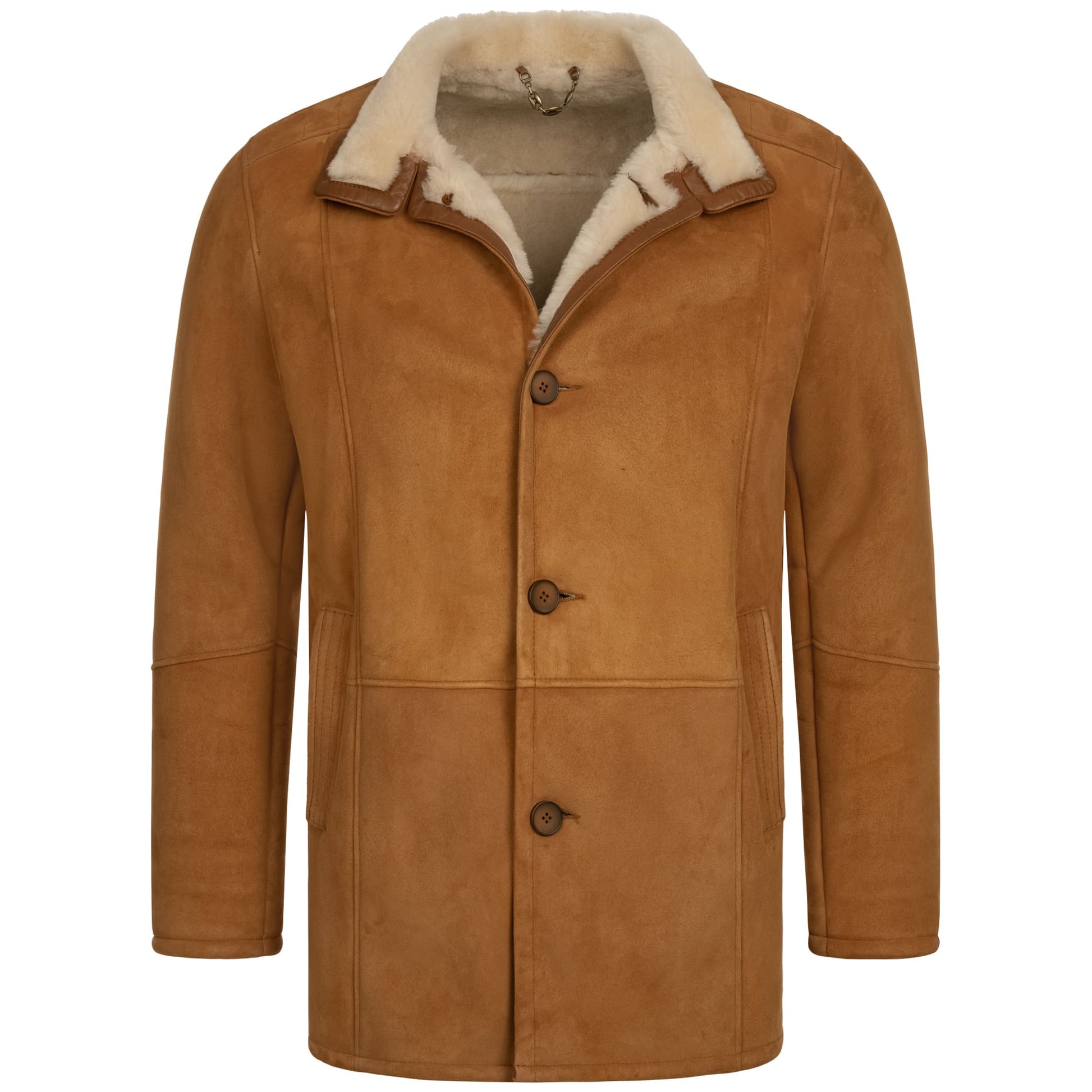 Dieser Herrenmantel vereint den warmen, edlen Farbton Whisky mit der luxuriösen Qualität von 100% echtem Velours-Lammfell. Das samtige Leder überzeugt durch eine matte, elegante Oberfläche, während das weiche Lammfell-Innenfutter zuverlässig vor Kälte schützt. Ob zu Jeans und Boots oder über dem Anzug – dieser Mantel ist ein stilvolles Statement für Männer, die Wert auf Klasse und Komfort legen.